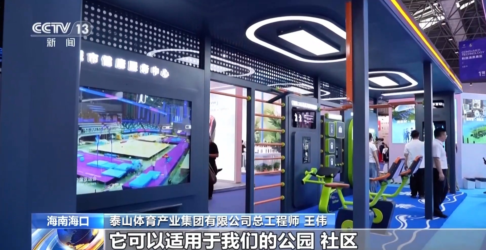 泰山体育产业集团有限公司总工程师 王伟:我们洞察到整个城市已经到达品质升级的阶段,把城市的功能要从单一的模式切换到它可以集成健康、智能、AI、便捷,把它融合成一个完整的解决方案。其实我们这款产品适应不同的场景,公交站场景来说,在这里骑行、锻炼、做个引体向上,它远比要拿着手机刷个小视频要健康很多,它可以适用于公园、社区、街边巷角、CBD、城乡接合部。