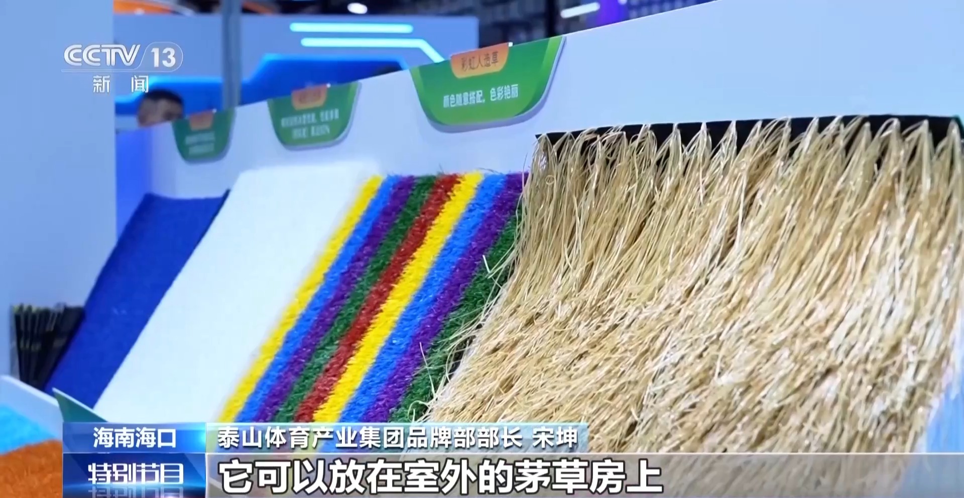 泰山体育产业集团品牌部部长 宋坤:我们这次带来了茅草屋的草坪,它可以放在室外的茅草房上,具有阻燃的这种效果。七彩阳光草,是幼儿园给孩子们铺装用的。滑雪人造草,洒上水之后,它可以模拟初级与中级的滑雪赛道。夜光人造草,它就是白天吸收太阳光照,然后晚上释放荧光。