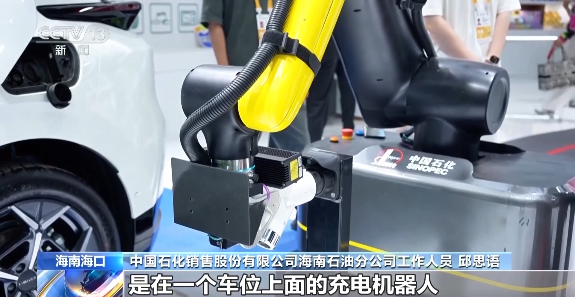 中国石化销售股份有限公司海南石油分公司工作人员 邱思语:我们给大家展示的是在一个车位上面的充电机器人,但是它并不是单独来充电的,是依托充电桩进行建设,通过轨道,同时服务于几十个充电车位。