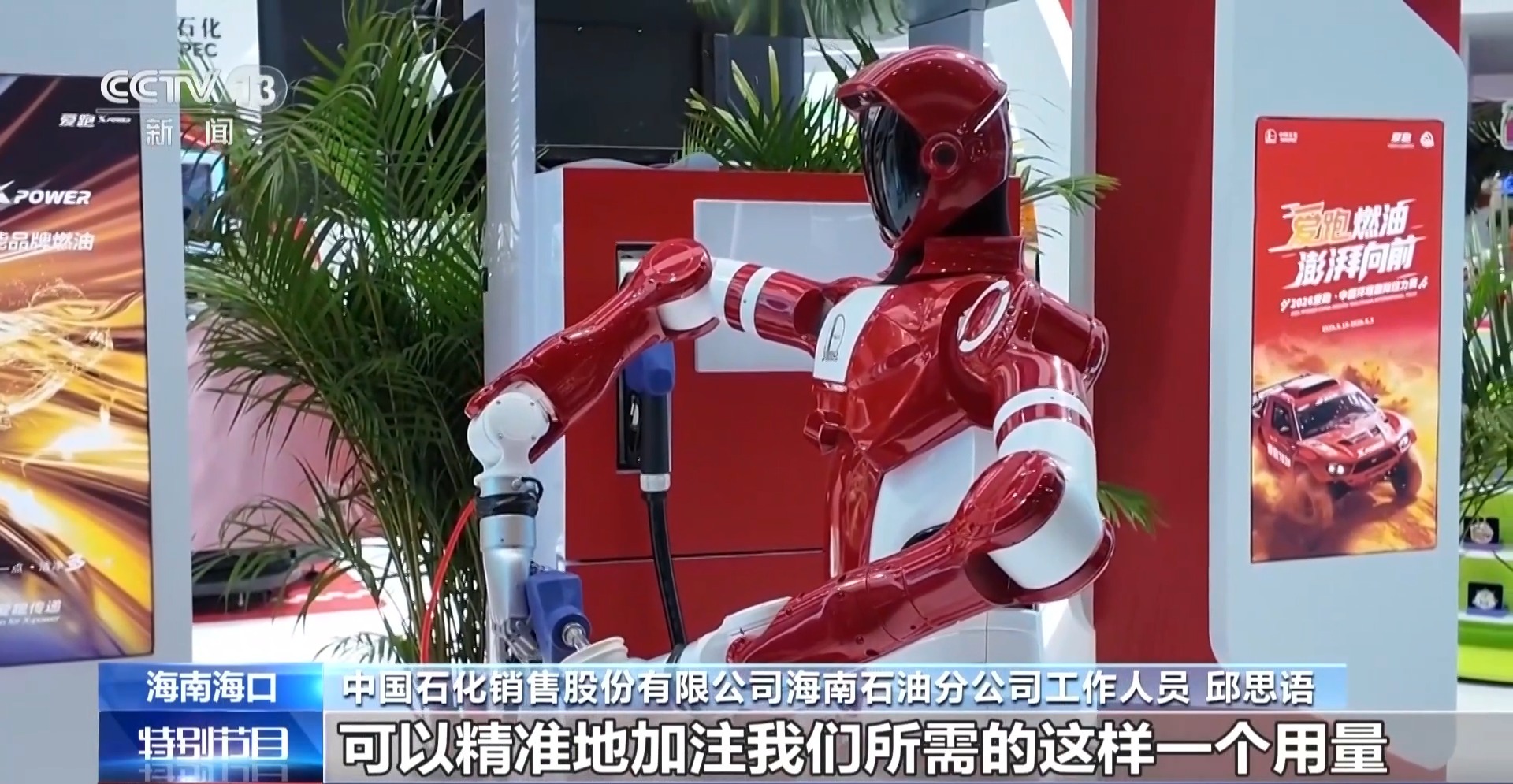 中国石化销售股份有限公司海南石油分公司工作人员 邱思语:这款加油侠机器人是中国石化和中科第五纪联合研发的具身智能机器人,它的手非常灵活,可以精准地加注我们所需的用量。有这样的一双灵活的手,除了在加油区,它也可以在零售区给客户进行拿货,进行智能巡检、智能补货。