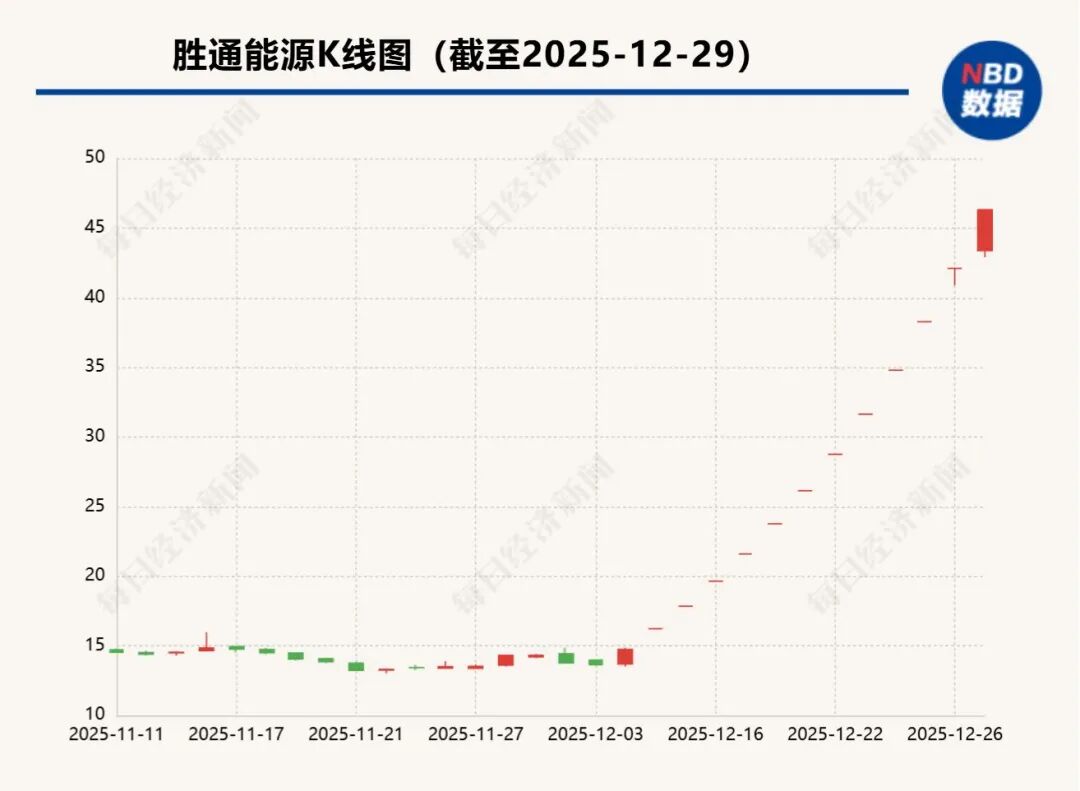 自2025年12月12日复牌以来,胜通能源股价狂飙。根据12月29日晚间发布的公告,从2025年12月12日至12月29日,其股票价格涨幅高达213.97%,期间多次触及股票交易异常波动情形。截至12月29日收盘,公司股价已高达46.31元/股。